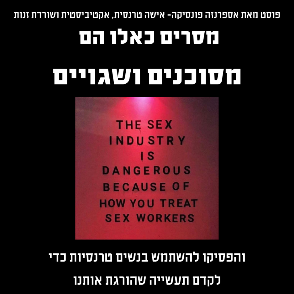 "חיבור נשים טרנסיות עם זנות זה טרנספוביה. אנחנו לא חפצים שתוכלו להשתמש בהם כדי להגן על תעשיית המין- למטרות- רווח שלכם מפני ביקורת. זנות אינה חיונית לזהות טרנסית, והתנהגות כאילו היא כן מבלבלת בין תנאי הדיכוי שלנו למה ש'טבעי'."